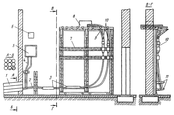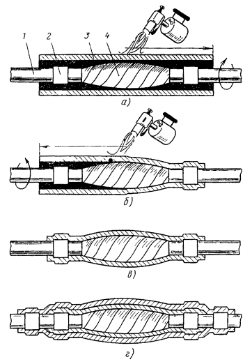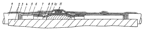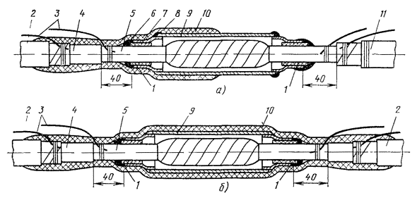 Рис. 12.17. Восстановление защитных изолирующих покровов типа Бп горячим способом: 1 - пряжа; 2 - броня; 3 - шланг; 4 - провод перепайки брони; 5 - место сварки полиэтиленовых деталей между собой и со шлангом; 6 - оболочка; 7 - конус полиэтиленовый; 8 - труба полиэтиленовая; 9 - слой ЛПК и лент; 10 - металлическая муфта; 11 - муфта чугунная