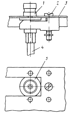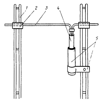 Рис. 15.51. Муфта АРУ: 1 - кожух; 2 - колодка; 3 - гайка; 4 - шайба; 5 - скоба для крепления 15.160. Общая длина соединительного кабеля (от БТД до муфты АРУ) должна быть: для систем К-3600 и К-1920П - 11,5 м (для корректирующего НУП системы К-3600 на кабеле КМ-8/6 - 12,5 м); для системы К-24Р (К-24Р и ПСС) – 10 м. 15.161. При прокладке магистрального кабеля в трубопроводе телефонной канализации (коллекторе) соединительные кабели АРУ должны быть проложены также в канализации на уровне прокладки магистрального кабеля. При этом длина соединительного кабеля для систем передачи К-3600, К-1920П допускается в необходимых случаях в пределах 5,25 м, а для системы К-24Р (К-24Ри ПСС) - 5,15 м. 15.162. По мере поступления БТД от предприятия-изготовителя заказчик должен проверить их исправность (входной контроль) путем измерений электрического сопротивления датчиков и результаты проверки зафиксировать в протоколе по форме 15.1. Перед проведением измерений БТД должны находиться в помещении, где производятся измерения, в течение не менее двух часов. Измерения должны производиться: в БТД РЕ2.149.006 и РЕ2.149.007 с контактов 1 - 2, 3 - 4, 5 - 6, 7 - 8, 11 - 12, 13 - 14 и 15 - 16; в БТД 2Г2.149.015 с контактов 1 - 3 и 11 - 13. Блоки термодатчиков считаются исправными, если отклонение измеренных величин сопротивлений датчиков от их среднего значения не превышает для БТД РЕ2.149.006 - 3 %, БТД РЕ2.149.007 и БТД 2Г2.149.015 - 10 %. Примечание. Для оценки исправности цепей термодатчиков системы К-24Р следует произвести измерения не менее трех БТД. Значения сопротивлений термодатчиков в зависимости от температуры окружающей среды приведены в табл. 15.6.