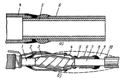 Рис. 12.19. Восстановление защитных изолирующих покровов типа БпШп горячим способом с устройством КИП: 1 - наружный шланг; 2 - конус полиэтиленовый с отводом; 3 - броня; 4 - провод к КИП от брони; 5 - место сварки полиэтиленовых деталей между собой, со шлангом кабеля и проводом к КИП; 6 - труба полиэтиленовая; 7 - муфта металлическая; 8 - провод перепайки брони; 9 - слой ЛПК и лент; 10 - муфта чугунная; 11 - припайка провода к КИП от оболочки Рис. 12.20. Восстановление защитных изолирующих покровов горячим способом при помощи полиэтиленовых полумуфт: 1 - шланг; 2 - место сварки шланга с полиэтиленовыми деталями; 3 - оболочка; 4 - слой ЛПК и лент; 5 - полумуфта; 6 - муфта металлическая; 7 - кольцо опорное стальное 12.28. При восстановлении изолирующих покровов горячим способом в случаях непоставки промышленностью полиэтиленовых конусов с отводами для КИП на муфтах, где проектом предусмотрено оборудование последних, допускается восстановление изолирующих покровов холодным способом. РЕМОНТ ПЛАСТМАССОВЫХ ШЛАНГОВЫХ ПОКРОВОВ12.29. Приведенные ниже методы ремонта защитных покровов шлангового типа могут применяться при устранении повреждений на проложенных в грунте или в кабельной канализации (колодцах) кабелях, а также при выявлении повреждений до прокладки на кабельных площадках. 12.30. Повреждения шланга могут быть условно разбиты на: а) точечные - сквозные отверстия (проколы, порезы и т.д.) размером по диаметру или по диагонали до 10 мм; б) оголенные участки - сдиры, пропуски и наслоения при наложении шланга, длинные порезы, пережимы и т.д. 12.31. Для ремонта шлангов применяют: а) термоусаживаемые цилиндрические трубки (для случаев, когда повреждение находится в непосредственной близости от конца кабеля) и ТУТ с продольным замком; б) многослойное наложение на поврежденный участок шланга компаунда ЛПК, чередующегося полиэтиленовыми лентами (холодный способ); в) наложение на поврежденное место отрезка пластмассовой накладки и приварка ее к шлангу под слоем стеклоленты. 12.32. Холодный способ и трубки ТУТ могут применяться для ремонта любых повреждений, а сварка под слоем стеклоленты - в основном при повреждениях, указанных в п. 12.30, а. 12.33. При ремонте шланга холодным способом необходимо: а) очистить от загрязнений место повреждения и шланг на расстоянии 60 - 80 мм по обе стороны от места повреждения (ремонтируемый участок); б) обрезать шланг на расстоянии 2 - 3 мм вокруг места повреждения; в) смыть бензином подклеивающий слой с оболочки до полного его удаления, затем промыть бензином ремонтируемый участок и просушить в течение 10 - 15 мин; г) заполнить место повреждения слоем ЛПК; д) нанести первый слой ЛПК на шланг по обе стороны от повреждения на расстоянии 40 - 50 мм; е) обмотать нанесенный ЛПК одним слоем полиэтиленовой ленты с 30 %-ным перекрытием; ж) нанести еще два слоя ЛПК и обмотать лентами с захватом шланга на 10 мм больше относительно предыдущего слоя ленты; з) обмотать ремонтируемый участок двумя слоями стеклоленты, пропитанный битумной массой Б-1. Допускается пропитка ленты массой МКБ или битумом № 4. 12.34. При ремонте шланга сваркой через стеклоленту необходимо: а) вырезать прямоугольную накладку из шланга размером на 5 - 10 мм больше поврежденного участка в каждую сторону; б) промыть накладку бензином и просушить в течение 10 - 15 мин; в) очистить от загрязнений место повреждения и шлан