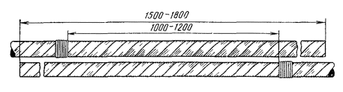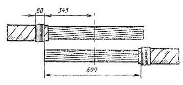 8.39. В месте, где намечается середина муфты, на каждый конец кабеля наложить бандаж из шпагата (или обрезков кабельных жил); при этом расстояние от бандажа до конца кабеля должно быть на 10 - 15 см больше половины длины муфты. 8.40. На дно котлована установить монтажный станок или монтажные козлы; расстояние между козлами должно быть на 2 - 3 см больше длины защитной муфты. Концы кабелей уложить на монтажный станок или козлы таким образом, чтобы сделанные на них отметки середины сростка совпадали (рис. 8.11), и временно закрепить их. В колодцах кабельной канализации концы кабелей укладывают на консоли и, при необходимости прикрепляют к ним. Рис. 8.11. Укладка концов кабеля на монтажные козлы Таблица 8.4 Размеры разделки концов кабелей в свинцовой оболочке