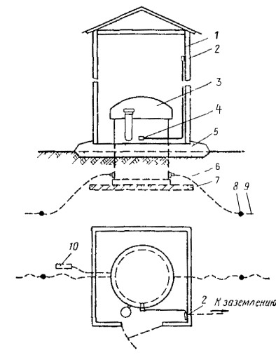 18.34. Протекторы могут устанавливаться с любой стороны защищаемого кабеля связи. Места установки протекторов определяются проектом. При параллельной прокладке нескольких кабелей протекторные установки следует располагать с той стороны защищаемого кабеля, где достигается максимальное удаление их от других подземных металлических сооружений. Расстояние между протекторной установкой и защищаемым сооружением связи должно быть: для одиночных протекторов - не менее 3 м, а для групповых протекторных установок - не менее 6 м. Расстояние между отдельными протекторами в группе должно быть не менее 3 м. 18.35. При защите сооружений связи, проложенных непосредственно в земле, протекторы устанавливают в специально отрываемых шурфах, а при защите сооружений, проложенных в кабельной канализации, - вблизи телефонного колодца в местах, удобных для их эксплуатации. 18.36. К монтажным работам, связанным с установкой протекторов в грунте, относится: рытье шурфов и траншей для установки протекторов и рытье траншей для прокладки соединительных проводов; установка протекторов; припайка соединительных проводов к оболочке кабеля, изоляция мест пайки и засыпка шурфов и траншей; установка и монтаж КИП для протекторов. 18.37. Соединительный провод, идущий от протектора к сооружению связи, укладывают в траншею глубиной 70 см и шириной 25 см. 18.38. При установке неупакованного протектора в шурфе или траншее на дно предварительно укладывают заполнитель слоем толщиной 40 - 55 мм. После этого устанавливают протектор, вокруг которого укладывают заполнитель. 18.39. При установке протектора в яме для равномерного распределения заполнителя вокруг протектора заполнитель укладывают в специальную форму из листовой стали в виде цилиндра диаметром 160 - 180 мм. Для удобства эта форма делается разъемной и с двумя ручками. После укладки в форму заполнителя яму засыпают землей до верхнего торца формы, землю трамбуют, а форму извлекают из земли. 18.40. При установке упакованных протекторов отрывают шурф диаметром, превышающим диаметр протектора на 50 мм. После установки в шурфе протектор засыпают грунтом, который периодически уплотняют, а затем заливают водой. 18.41. При подключении протекторов через КИП-2 провода, идущие от протекторов, подключают к клеммам 1 - 4, а от цистерны - к клемме 5 (рис. 18.7, а, б). Рис. 18.7. Схема протекторной защиты НУП (а) и подключение протекторов к клеммному щитку (б): 1 - 4 - протекторы, 5 - цистерна; 6 - изолирующая муфта; 7 - кабели связи 18.42. В состав монтажных работ, связанных с установкой протекторов для защиты цистерн НУП, кроме указанных в п. 18.36, входят также установка щитка на стене в наземной части НУП и подсоединение к нему проводов, идущих от протекторов и корпуса НУП. 18.43. Количество и места установки протекторов для защиты цистерн НУП определяются проектом. 18.44. Протекторы для защиты НУП устанавливают в грунт на глубину 1,5 м от поверхности земли до верхнего торца протектора. Если промерзание грунта превышает 1,4 м, то глубина закопки соответственно увеличивается. 18.45. Соединительный провод от щитка КИП подключают к специальному болту, который приварен к горловине цистерны. 18.46. При оборудовании поляризованных протекторных установок их вентильные элементы (германиевые или кремниевые диоды) устанавливают на клеммном щитке КИП в соответствии с рабочей документаци