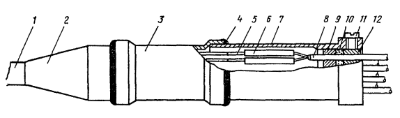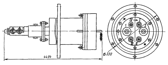 Устройства АРУ для системы передачи К-60П15.169. Изложенные ниже требования по монтажу устройств грунтовой АРУ на НУП системы передачи К-60П распространяются на внутризоновые симметричные высокочастотные кабели с кордельно-полистирольной изоляцией типа МКС. 15.170. В качестве соединительного кабеля между БТД и муфтой АРУ (боксом, муфтой ГМС) должен прокладываться кабель того же типа, что проложен на линии. Если на линии проложен кабель в алюминиевой или стальной гофрированной оболочке, для АРУ следует применять кабель в свинцовой оболочке. 15.171. Длина соединительного кабеля (от БТД до муфты АРУ) не должна превышать 10 м (определяется проектом). Глубина заложения БТД должна быть такой же, как проектная глубина прокладки линейного кабеля. 15.172. До начала работ соединительный кабель, БТД и муфта АРУ должны быть проверены на соответствие их электрических характеристик установленным нормам. 15.173. Для монтажа соединительного кабеля с БТД необходимо: а) разделать конец кабеля согласно рис. 15.56. На расстоянии 510 мм от конца наложить бандаж на наружный покров кабеля. Смотать пряжу в рулончики (не обрезая) и временно прикрепить. На расстоянии 490 мм от конца наложить временный бандаж из медной проволоки на бронеленты, размотать их, не обрезая, и временно укрепить. Удалить подброневой покров. Очистить свинцовую оболочку. На расстоянии 375 мм от конца удалить свинцовую оболочку; Рис. 15.56. Разделка кабеля для монтажа БТД системы передачи К-60П: 1 - пряжа, 2 - бронеленты; 3 - оболочка, 4 - жилы б) на расстоянии 10 мм от места среза оболочки наложить бандаж из ниток на поясную изоляцию и оборвать ее около бандажа. Каждую четверку обмотать лентой из кабельной бумаги шириной 15 - 20 мм, которую на конце закрепить нитками; в) надвинуть каркас на разделанный конец кабеля так, чтобы расстояние между концом патрубка и бандажом на наружном покрове было 55 мм, а плата с установленными на ней термодатчиками находилась в горизонтальном положении. При этом автотрансформаторы должны быть расположены по четыре сверху и снизу; г) припаять патрубок каркаса к свинцовой оболочке припоем ПОССу-30-2; д) уложить четверки так, чтобы красная и зеленая расположились вдоль верхнего ряда, а желтая и синяя - вдоль нижнего; снять бумажные ленты с четверок; расположить и обрезать жилы по стрипсам. Удалить изоляцию с жил на длине 10 мм, обмотать каждую пару полиэтиленовой лентой с 50 %-ным перекрытием, залудить концы и припаять к стрипсам припоем ПОССу-61-0,5; е) измерить характеристики кабеля с включенными термодатчиками, которые должны соответствовать установленным нормам; ж) обмотать каркас с припаянными жилами двумя слоями кабельной бумаги с 50 %-ным перекрытием; между слоями уложить паспорт (форма 15.2), обмотку закрепить нитками; з) надвинуть на каркас стакан термоблока и спаять его с крышкой припоем ПОССу-30-2 (рис. 15.57). Проверить герметичность стального корпуса термоблока, для чего: впаять вентиль в конец кабеля, накачать кабель вместе с термоблоком осушенным воздухом и опустить блок в воду на 5 мин (или покрыть мыльной пеной). При отсутствии пузырьков блок считается герметичным; и) покрыть стальной корпус термоблока и оголенную часть кабеля двумя слоями битумно-резиновой мастики, чередующимися с обмоткой полиэтиленовой пленкой. Поверх второго слоя пленки наложить третий слой мастики. Обмотать кабель 