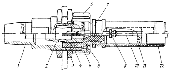 МОНТАЖ ОБОРУДОВАНИЯ ДЛЯ СОДЕРЖАНИЯ КАБЕЛЯ ПОД ИЗБЫТОЧНЫМ ДАВЛЕНИЕМ17.89. Монтажу подлежит только исправное оборудование, проверенное в соответствии с пп. 17.65 - 17.88 настоящего Руководства, при наличии протоколов испытания. Монтаж установки для содержания кабеля под давлением УСКД-1М17.90. В ОП (ОУП ПОУП, ОРП) в соответствии с рабочими чертежами установить УСКД-1М на стене при помощи четырех анкерных болтов. Болты в комплект установки не входят. 17.91. При монтаже установку необходимо выставить по уровню, закрепить и заземлить. 17.92. Слева на расстоянии 400 мм от установки установить хомут для крепления баллона. 17.94. Баллон с воздухом установить на основание и закрепить стяжным хомутом. 17.96. Закрыть выходы воздуха из установки и открыть вентиль баллона. Манометр на 0,16 МПа (1,6 кгс/см2) покажет давление на выходе установки 0,05 ± 0,002 МПа (0,5 ± 0,02 кгс/см2). 17.97. Проверить герметичность мест соединения воздуховода с установкой и с вентилем баллона путем нанесения мыльного раствора. 17.98. Выложить воздуховоды к кабелям в пакет. На конец воздуховода, идущего к установке, надеть гайку 3т8.930.003 и ниппель 3т8.652.002 (входят в комплект монтажных частей). Развальцевать воздуховод при помощи развальцовочного устройства (рис. 17.3) и продуть его. С одного конца воздуховод подпаять к кабелю, а с другого подключить к штуцеру вентиля установки. Аналогичным образом подключить и другие воздуховоды. Проверить герметичность мест соединения воздуховодов путем нанесения мыльного раствора. Свободные штуцеры установки «Вход в кабели» закрыть заглушками. Рис. 17.3. Развальцовочное устройство 17.99. Подключить установку к системе телесигнализации, для чего конец кабеля сигнализации распаять на розетку 2РМ22КУН10Г1В1 (входит в комплект инструмента и принадлежностей) по схеме, указанной в рабочих чертежах. Монтаж автоматической установки для содержания кабелей связи под избыточным газовым давлением АУСКИД-1 (АУСКИД)17.100. В ОП (ОУП, ПОУП, ОРП) в соответствии с рабочими чертежами установить кронштейн и хомут, которые входят в комплект монтажных частей установки. Крепежные детали кронштейна и хомута предусмотрены для установки их в каменных или железобетонных стенах. 17.101. Закрепить установку к кронштейну при помощи крепежных деталей, входящих в комплект монтажных частей, и заземлить. 17.102. Требования по наполнению баллонов сжатым воздухом и подсоединению к установке аналогичны требованиям, указанным в пп. 17.93 - 17.95. 17.103. Монтаж воздуховодов (трубопроводов), соединяющих установку с кабелями, произвести в следующем порядке: закрыть на лицевой панели установки все вентили; подсоединить воздуховоды к выходным штуцерам установки; соединить воздуховоды рукавами и закрепить хомутиками; открыть вентиль баллона; открыть вентиль «Шунт» и один из вентилей подачи воздуха в кабель; продуть воздуховоды и вентиль закрыть. 17.104. Таким же образом поочередно продуть и остальные воздуховоды. 17.105. Концы воздуховодов подпаять к штуцеру кабелей, которые должны находиться под избыточным воздушным давлением. Перед пайкой необходимо открыть вентиль, соответствующий данному кабелю, а также снять заглушку со штуцера «В атмосферу». При этом воздух из кабеля будет выходить наружу, что позволит провести качественную пайку. 17.106. Открыть вентиль баллона и все вентили к кабелям; при этом воздух через шунтирующее устр