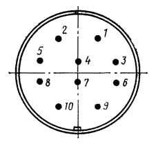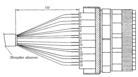 д) поместить БТД в свинцовый стакан (рис. 15.53, б). Сдвинуть ранее надетый на конец кабеля свинцовый цилиндр так, чтобы стакан входил в него на 10 - 15 мм. Зачеканить конус цилиндра таким образом, чтобы конец его плотно прилегал к оболочке. Спаять свинцовый цилиндр со стаканом, а затем с оболочкой кабеля (рис. 15.54). е) уложить смонтированный свинцовый корпус БТД в чугунную муфту МЧ-65 и залить ее битумной массой, температура которой должна быть не выше 100 - 110 °С. Примечание. При установке БТД в телефонной канализации чугунная муфта не устанавливается; свинцовый корпус следует покрыть слоем мастики МБР и обмотать стеклолентой с 30 %-ным перекрытием. Рис. 15.54. Общий вид смонтированного БТД (в разрезе): 1 - кабель; 2 - цилиндр; 3 - стакан; 4 - жилы кабеля; 5 - изолирующие гильзы; 6 - групповые кольца; 7 - выводные проводники; 8 - стрипсы; 9 - крышка; 10 - корпус; 11 - чугунная муфта; 12 - битумная масса; 13 - пробка деревянная 15.166. Для монтажа соединительного кабеля с муфтой АРУ необходимо: а) в соответствии с рабочими чертежами проекта уточнить место расположения муфты АРУ для данной аппаратуры; б) уложить кабель по металлоконструкциям от вводного патрона до места расположения муфты АРУ; удалить излишнюю длину кабеля и снять свинцовую оболочку на расстоянии 150 мм от его конца; в) надвинуть на конец кабеля кожух муфты АРУ; г) у обреза свинцовой оболочки наложить бандаж из ниток на поясную изоляцию и оборвать ее около бандажа; надвинуть на каждую жилу поверх изоляции гильзу 5×5,5×50 мм; залудить контактные проволоки колодки муфты АРУ и концы жил кабеля припоем ПОССу-61-0,5 на длине 10 мм; д) закрепить временно муфту; припаять жилы кабеля к контактам муфты АРУ согласно табл. 15.8. Нумерация контактов показана на рис. 15.55. Надвинуть на места паек изолирующие жилы; е) обмотать сросток с захватом оболочки кабеля двумя - тремя слоями кабельной бумаги и укрепить их нитками; между слоями бумаги уложить паспорт; ж) надвинуть на сросток кожух муфты; при этом свинцовая оболочка кабеля должна входить внутрь кожуха на 10 - 15 мм. Припаять патрубок кожуха к оболочке кабеля и расширенную часть кожуха к колодке муфты; кромки кожуха и колодки должны быть предварительно тщательно зачищены и залужены. Таблица 15.8 Распайка жил кабеля в муфте АРУ