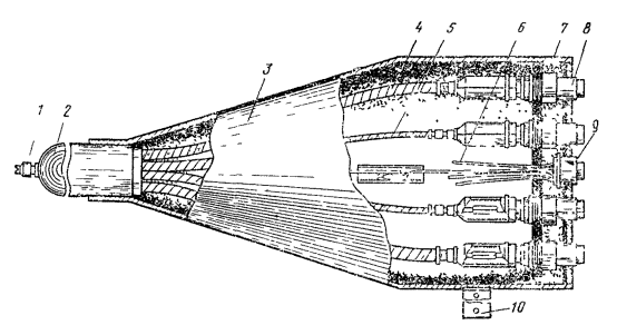 15.72. Длина магистральных кабелей, введенных в цистерну НУП, должна составлять 1200 мм вне зависимости от положения коаксиальных пар на концах кабеля. 15.73. Сращивание магистрального кабеля со стабкабелем УОК должно производиться в прямой соединительной муфте в соответствии с требованиями разд. 9. 15.74. Расположение УОК и места установки соединительных муфт определяются рабочими чертежами проекта. Крепление соединительной муфты должно производиться при помощи хомутов и стяжек, входящих в комплект поставки цистерны; УОК крепится к кронштейну, причем хомут крепления поставляется вместе с УОК, а болт крепления - в комплекте цистерны НУП. 15.75. Подключение кабеля к оборудованию для содержания под постоянным избыточным давлением должно производиться путем впайки конца медной трубки воздуховода в конус соединительной муфты с линейной стороны. 15.76. Измерение электрических параметров смонтированного кабеля (усилительного участка, секции) после установки УОК и монтажа соединительной муфты должно производиться с разъемов УОК при помощи коаксиальных разъемов-переходников и переходных шнуров, входящих в комплект поставки УОК 15.77. После проведения электрических измерений на свободных коаксиальных и симметричных разъемах должны быть установлены металлические заглушки. Общий вид УОК со стабкабелем показан на рис. 15.28, а положение УОК и соединительной муфты в НУП - на рис. 15.29. Рис. 15.28. Общий вид УОК со стабкабелем КМ-8/6: 1 - вентиль; 2 - стабкабель; 3 - корпус; 4 - коаксиальная пара 2,6/9,4; 5 - коаксиальная пара 1,2/4,6; 6 - симметричные пары; 7 - герметизирующий компаунд; 8 - коаксиальный разъем; 9 - симметричный разъем; 10 - кронштейн для крепления Рис. 15.29. Положение УОК и соединительной муфты в НУП: 1 - цистерна; 2 - линейный кабель; 3 - стяжка; 4 - хомут; 5 - соединительная муфта; 6 - стабкабель; 7 - УОК МОНТАЖ ВВОДНО-КАБЕЛЬНОГО УСТРОЙСТВА (МУФТЫ КАЕ) НА КАБЕЛЕ КМ-415.78. Ввод магистральных кабелей в цистерну должен выполняться в соответствии с рабочими чертежами проекта. Длина кабеля внутри цистерны должна быть порядка 1,2 м; при этом положение коаксиальных пар на конце кабеля не регламентируется и может быть любым. Монтаж вводного патрона цистерны производится согласно рис. 15.4. 15.79. До начала работ по установке и монтажу муфты КАЕ следует подвергнуть внешнему осмотру, проверке на герметичность, целость жил (прозвонка) и соответствие электрического сопротивления и электрической прочности изоляции установленным нормам. Результаты проверки должны быть зафиксированы в виде справки в протоколе формы 17.4, составляемом заказчиком при проведении входного контроля и передаваемом строительной организации вместе с муфтой КАЕ. Выявленные при проверке дефекты должны быть устранены в соответствии с рекомендациями, изложенными в инструкции поставщика (входит в комплект поставки). Муфты, в которых дефекты согласно инструкции поставщика не могут быть устранены, установке не подлежат. 15.80. Развозка муфт КАЕ к местам установки должна производиться только в заводской упаковке, исключающей их повреждение при транспортировке. 15.81. Непосредственно перед установкой вынуть муфту из транспортного ящика, путем внешнего осмотра убедиться в отсутствии механических повреждений, проверить наличие избыточного воздушного давления. В случае отсутствия избыточного давления произвести испыта