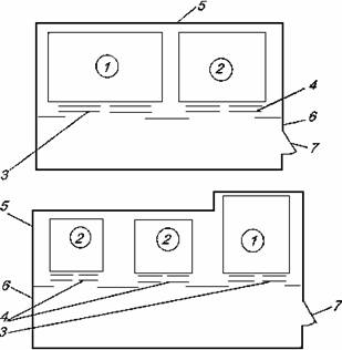 Рис. 1. Примеры размещения лифта для пожарных в общей шахте с другими пассажирскими лифтами: 1 – лифт для пожарных; 2 – пассажирские лифты; 3 – противопожарная дверь шахты лифта для пожарных с пределом огнестойкости EI 60; 4 – противопожарная дверь шахты пассажирских лифтов с пределом огнестойкости EI 60; 5 – ограждающие конструкции общей шахты с пределом огнестойкости REI 120; 6 – противопожарные перегородки 1-го типа, ограждающие лифтовый холл (тамбур); 7 – противопожарная дверь 2-го типа лифтового холла (тамбура) в дымогазонепроницаемом исполнении