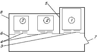 Рис. 2. Примеры размещения лифта для пожарных в обособленной (выгороженной) шахте с общим лифтовым холлом с другими лифтами: 1 – лифт для пожарных; 2 – пассажирские лифты; 3 – противопожарная дверь шахты лифта для пожарных с пределом огнестойкости EI 60; 4 – противопожарная дверь шахты пассажирских лифтов с пределом огнестойкости E 30; 5 – ограждающие конструкции шахты лифта для пожарных с пределом огнестойкости REI 120; 6 – противопожарные перегородки 1-го типа, ограждающие лифтовый холл; 7 – противопожарная дверь 2-го типа лифтового холла в дымогазонепроницаемом исполнении; 8 – ограждающие конструкции шахты пассажирских лифтов с пределами огнестойкости, установленными соответствующими СНиП