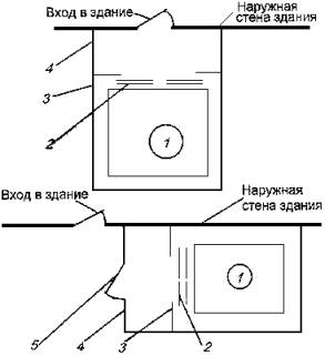 Рис. 3. Примеры размещения лифта для пожарных у наружной стены общественного или производственного здания (сооружения): 1 – лифт для пожарных; 2 – противопожарная дверь шахты лифта для пожарных с пределом огнестойкости EI 60; 3 – ограждающие конструкции шахты с пределом огнестойкости REI 120; 4 – противопожарные перегородки 1-го типа, ограждающие лифтовый холл (тамбур); 5 – противопожарная дверь 2-го типа лифтового холла (тамбура) в дымогазонепроницаемом исполнении * Допускается использовать материалы с коэффициентом дымообразования до 750 м2/кг включительно. |