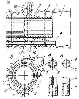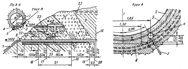 Рис. 60. Комбинированный (общий и местный) дренаж на ГЭС Варсак (Пакистан), (Л. 190]: а - поперечный разрез по напорным водоводам; б - типовое сечение водовода; в присоединение дренажа к стальной облицовке; 1 - дрены в скале; 2 - водовод; 3 - стальная облицовка; 4 - продольные дренажные трубы; 5 - дренажная скважина; 6 - пробка (заглушка).