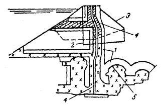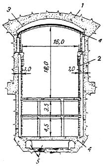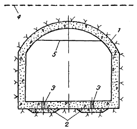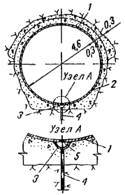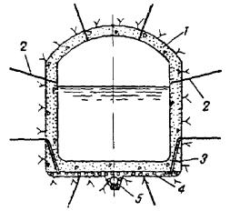 Рис. 66. Проходной дренаж турбинного водовода ГЭС Соверзен (Италия), [Л. 87]: 1 - бетонная обделка; 2 - труба для контрольной цементации; 3 - дренажная галерея; 4 - трубы, расположенные друг от друга на расстоянии 2,5 м; 5 - стальная облицовка.