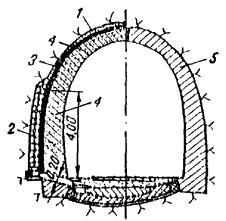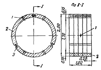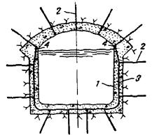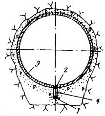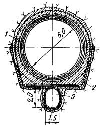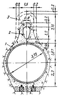 Рис. 67. Проходной дренаж туннеля ГЭС Изер-Арк (Франция), [Л. 151]: 1 - водонепроницаемая оболочка; 2 - сухая кладка для дренажа; 3 - дренажная галерея.