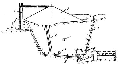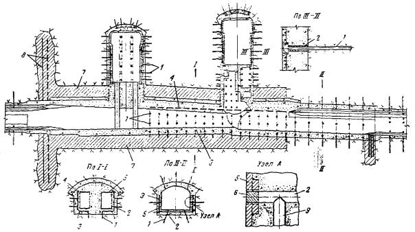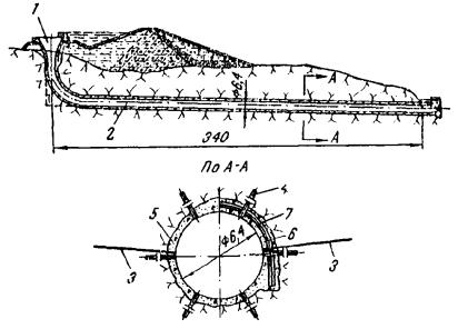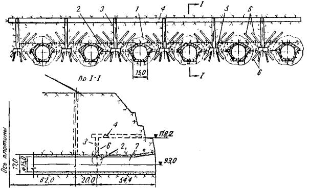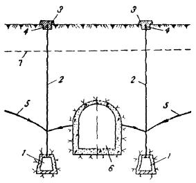Рис. 59. Схема общего комбинированного дренажа туннелей Астраханского гидроузла, [Л. 161, 48,а, 86,а]: 1 - зона цементации; 2 - транспортный туннель, закладываемый бетоном после окончания строительства; 3 - вертикальная шахта сечением 2,2 ´ 2,2 м; 4 - вспомогательный дренажный туннель (до водоприемника около 200 м); 5 - подшахтная полость; 6 - дренажные скважины Æ 105 мм, длиной 17 - 20 м; 7 - водосборный туннель.