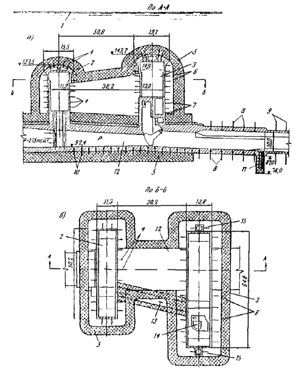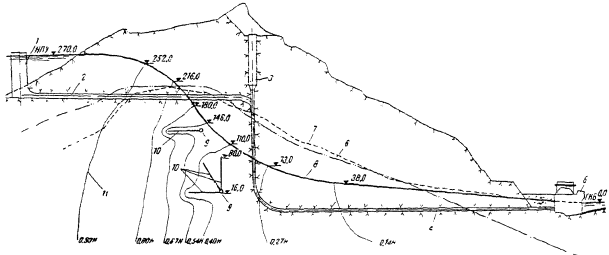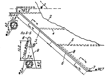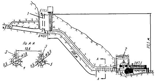 Рис. 68. Проходной дренаж напорных водоводов ГЭС Кордеак (Франция), [Л. 151]: 1 - уравнительная шахта; 2 - электростанция; 3 - дренажная галерея сечением 0,8 ´ 1,8 м; 4 - металлическая облицовка толщиной 21 мм; 5 - металлическая облицовка толщиной 16 мм.