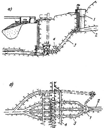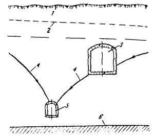 Рис. 61. Комбинированный дренаж: туннельный и лучевой скважинный, [Л. 16, 172]: 1 - глубокие скважины; 2 - камеры для бурения; 3 - дренажный туннель; 4 - защищаемый туннель.