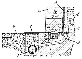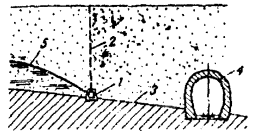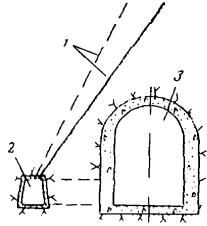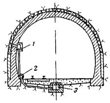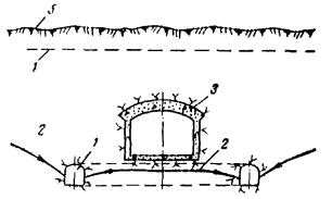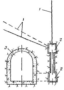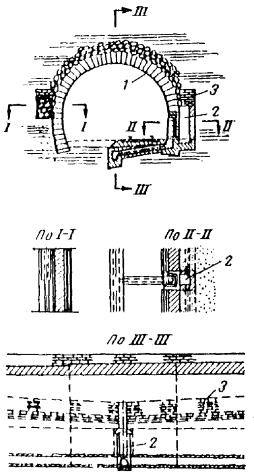 Рис. 77. Разгрузочные отверстия в обделке транспортного туннеля, [Л. 30]: 1 - приемник у отверстия; 2 - коллекторная труба; 3 - магистральная дренажная канава.