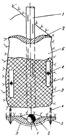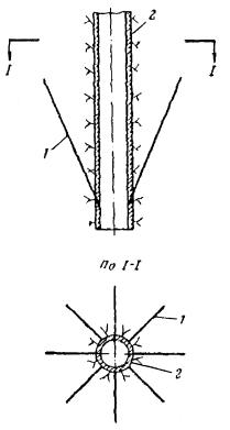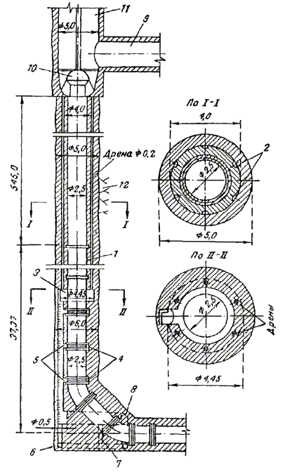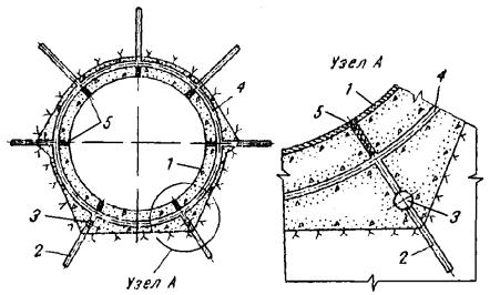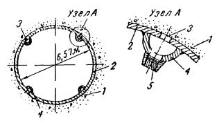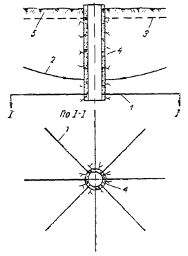 Рис. 45. Шпуровой дренаж напорного трубопровода ГЭС Ляк Нуар (Франция), [Л. 99, 54]: 1 - стальная облицовка; 2 - отверстия для цементации; 3 - полутруба Æ 20 см, приваренная к стальной облицовке; 4 - шпуровая дрена, пробуренная после выполнения цементации; 5 - заглушка.