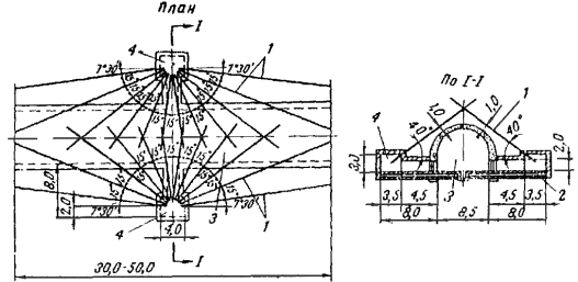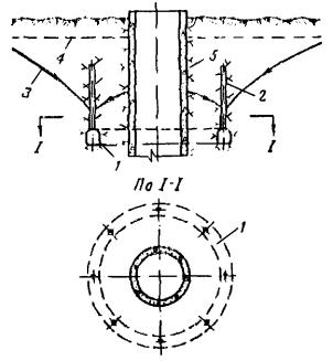 Рис. 42. Двусторонний лучевой дренаж, [Л. 16, 171, 172]: 1 - дренажные скважины; 2 - водоотводные лотки; 3 - защищаемый туннель; 4 - камеры для бурения.