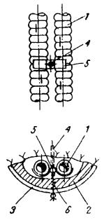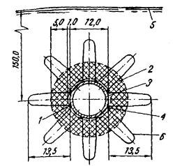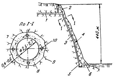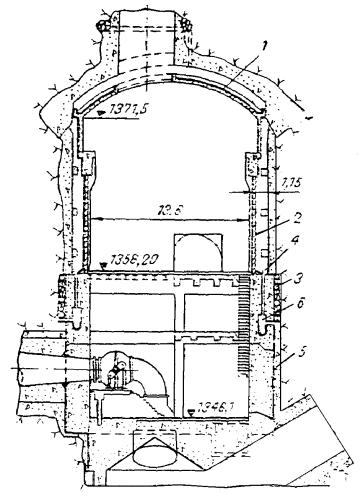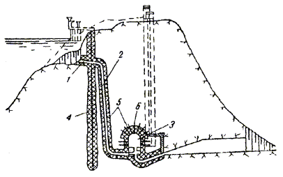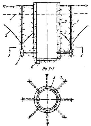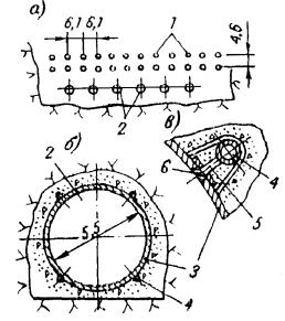 Рис. 78. Схема цементации и дренажа в подземной ГЭС, [Л. 10]: 1 - водоприемник; 2 - напорная шахта; 3 - подземное здание станции; 4 - противофильтрационная завеса; 5 - зона укрепительной цементации; 6 - шпуровой дренаж.