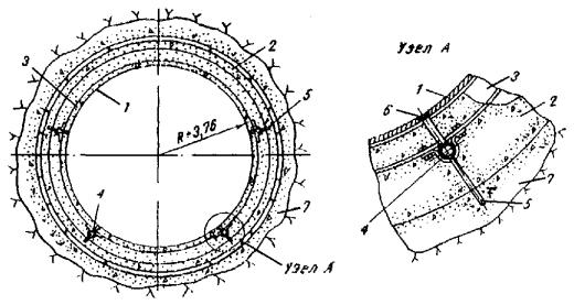 Рис. 50. Продольный трубчатый дренаж напорного трубопровода ГЭС Мезэ (Италия), [Л. 100, 151]: 1 - волнистая стальная рубашка толщиной 5 мм; 2 - дрена - обернутый парусиной соломенный жгут; 3 - дренажная засыпка; 4 - дрены - трубы из листов железа, перфорированные, размер отверстий 1 см. Рис. 51. Дренаж напорной шахты Храм ГЭС-1 (вариант с подземным зданием ГЭС), [Л. 60]: 1 - напорный туннель; 2 - уравнительная шахта; 3 - наклонная напорная шахта; 4 - штреки строительные; 5 - подземная ГЭС; 6 - отводящий туннель; 7 - стальная облицовка толщиной 10 мм; 8 - железобетон; 9 - гранит; 10 - дренажные трубы. Рис. 52. Дренаж напорной шахты Храм ГЭС-1 (вариант с подземным зданием ГЭС), [Л. 100]: 1 - дренажные скважины; 2 - смотровая галерея и дренажный коллектор; 3 - бетонная обделка со стальной гофрированной облицовкой. Рис. 53. Дрена из пластмассовой трубы, [Л. 85]: 1 - перфорированная пластмассовая труба; 2 - шлаковатный ковер; 3 - металлическая сетка; 4 - анкер; 5 - прижимная планка; 6 - слой водонепроницаемой бумаги. Рис. 54. Дрена из гофрированных пластмассовых трубок (применяется в местах изгибов), [Л. 85]: 1 - гофрированная пластмассовая трубка с отверстиями; 2 - шлаковатный ковер; 3 - металлическая сетка; 4 - анкер; 5 - прижимная планка; 6 - хомутик. Рис. 55. Машинный зал подземной ГЭС с дренажными полостями между стенами, сводом и скалой, [Л. 191] Рис. 56. Разгрузочные отверстия в металлической облицовке напорного водовода ГЭС Апер Кемпбелл Лейк (Канада), [Л. 190]: 1 - бетон обделки; 2 - металлическая облицовка; 3 - разгрузочные отверстия; 4 - труба, приваренная к облицовке; 5 - заглушка. Риг. 57. Разгрузочные отверстия в металлической облицовке шахтного водовода ГЭС Сан-Джиакомо (Италия), [Л. 183]: 1 - бетон обделки; 2 - облицовка толщиной 8 мм; 3 - водосборные трубы Æ 120 мм; 4 - патрубки, врезанные в металлическую облицовку.