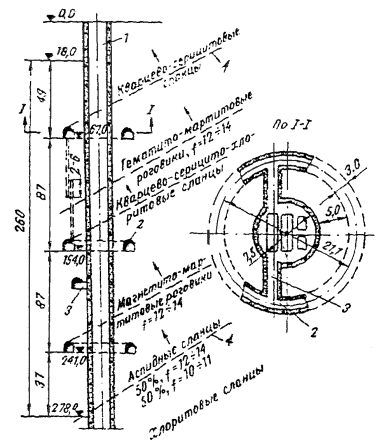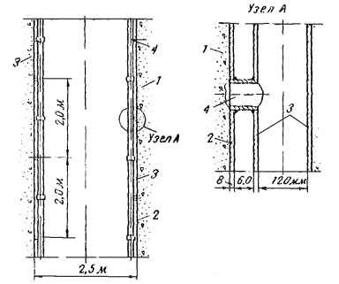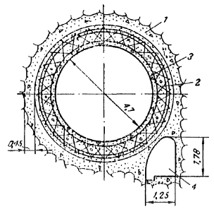 Рис. 58. Дренаж напорного водовода ГЭС Нило Пекана (Бразилия), [Л. 197, 88]: 1 - дренажная труба; 2 - заглушка; 3 - металлическая облицовка; 4 - дренажная скважина.