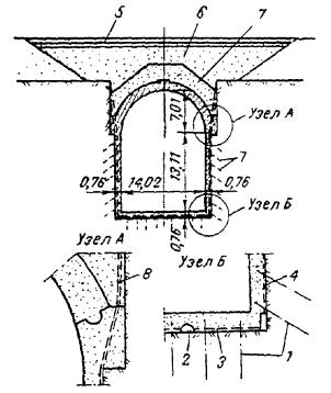 Рис. 30. Дренаж и гидроизоляция обделки туннеля, [Л. 30]: 1 - дренажная засыпка из щебня; 2 - дренажная забутовка из камня; 3 - гидроизоляция оклеечная; 4 - новая облицовка из бетона; 5 - старая обделка из камня Рис. 31. Дренаж транспортного (а) и шинно-транспортного (б) туннелей ГЭС Вальсура (Италия), [Л. 191]: 1 - дренажная засыпка; 2 - дренажная труба; 3 - водоотводной лоток; 4 - засыпка галькой. Рис. 32. Дренажные туннели Братской ГЭС в прочных песчаниках и выветрелых диабазах, [Л. 1]: 1 - дренажные скважины диаметром 42 мм, длиной 1,50 м; 2 - дренажные скважины диаметром 245 мм, пробуренные с поверхности земли; 3 - цементационные отверстия диаметром 50 мм, длиной, равной толщине обделки; 4 - настил из досок толщиной 50 мм; 5 - предохранительная решетка; 6 - цементируемая полость над сводом туннеля. Рис. 33. Шпуровой дренаж обделки с металлической облицовкой (применяемый в Югославии), [Л. 185]: 1 - металлическая облицовка; 2 - металлическая труба Æ 42 мм; 3 - коллекторная труба Æ 82 мм; 4 - шпуровая дрена; 5 - временная заглушка; 6 - сварка; 7 - заглушка (пробка). Рис. 34. Конструкция дренажного туннеля с внутренним фильтром, [Л. 30]: 1 - водоупор; 2 - кривая депрессии; 3 - железобетон; 4 - фильтр; 5 - плиты со щелями; 6 - насыпной грунт. Рис. 35. Подземная ГЭС Портидж Маунтин (Канада), [Л. 25]: 1 - дренажные туннели; 2 - цементационная завеса; 3 - плотина; 4 - башня водоприемника; 5 - трубопровод с металлической облицовкой № 1; 6 - машинный зал; 7 - кабельная шахта.