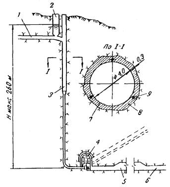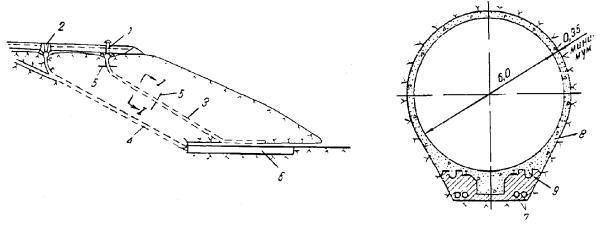 Рис. 47. Дренаж шахтного водосброса плотины Вискитаун (США), [Л. 133]: 1 - воронка водосброса; 2 - туннель; 3 - дренажные скважины глубиной 6 м; 4 - цементационные скважины глубиной 9 м; 5 - полусечение туннеля без крепи; 6 - полусечение туннеля с арочной крепью; 7 - арочная крепь, забетонированная в обделку. Рис. 48. Дренаж шахтного трубопровода ГЭС Сан-Джиакомо (Италия), [Л. 183]: 1 - металлическая облицовка толщиной 8 мм; 2 - дрены; 3 - кольцевая камера; 4 - кольцевой дренаж; 5 - выпуски (стоки); 6 - сточная труба; 7 - смотровой колодец; 8 - подходная галерея; 9 - подводящий туннель; 10 - затвор колокольный; 11 - уравнительная шахта; 12 - известняк. Рис. 49. Дренаж напорной шахты ГЭС Бромма (Франция), [Л. 186, 151, 100]: 1 - напорный туннель; 2 - уравнительная шахта; 3 - две напорные шахты; 4 - подземная ГЭС; 5 - резервуар; 6 - отводящий туннель; 7 - стальная облицовка; 8 - бетон; 9 - дрены Æ 15 см.