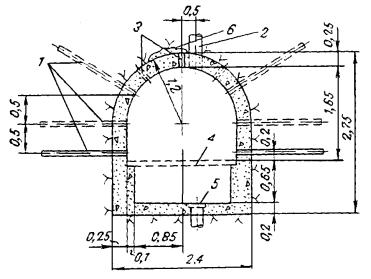 Рис. 62. Комбинированный дренаж: туннельный и скважинный, [Л. 50]: 1 - защищаемый туннель; 2 - водоотводная канава; 3 - дренажные туннели; 4 - дренажные отверстия; 5 - скважины. Рис. 63. Гидроизоляция и дренаж подземной Севанской ГЭС. Разрез по водовыпуску, [Л. 75, 141]: 1 - рубероид на клебемассе (свод); 2 - битумная окраска в два слоя; 3 - дренажная засыпка; 4 - дренажная канавка; 5 - асфальтовые плиты толщиной 2,5 см; 6 - дренажная галерея.