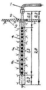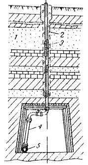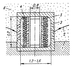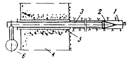 Рис. 73. Дренажная скважина в основании машинного здания ГЭС Детцем (ФРГ), [Л. 83]: 1 - труба Æ 50 мм; 2 - картонная прокладка площадью 0,12 м2, пропитанная битумом; 3 - набрызг-бетон слоем 4 см; 4 - скважина Æ 125 мм; 5 - щелевой фильтр из труб Æ 50 мм (сверху на длине 50 см труба не имеет щелей, снизу труба заглушена); 6 - фильтровая обсыпки из гравия крупностью 3 - 7 мм. Рис. 74. Забивной фильтр в неустойчивых скальных породах, [Л. 44]: 1 - скважина; 2 - конус; 3 - перфорированная трубка (фильтр) Æ 50 мм; 4 - бетонная обделка сооружения; 5 - металлическая труба; 6 - водоотводной коллектор.