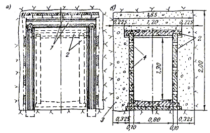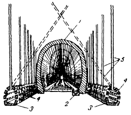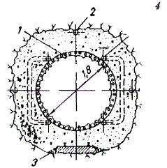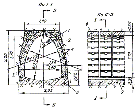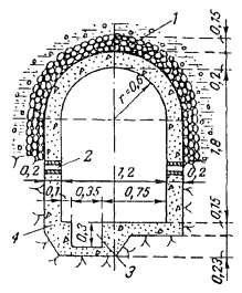 Рис. 36. Конструкция дренажного туннеля, [Л. 30]: 1 - дренажная засыпка; 2 - дренажные окна; 3 - водоотводный лоток; 4 - бетонная обделка.