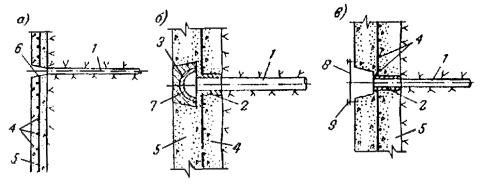 Рис. 43. Скважинный дренаж шахты: 1 - дренажные скважины; 2 - цементационные скважины; 3 - водосборник; 4 - кольцевая дренажная выработка. Рис. 44. Конструкция коллектора шпурового дренажа (из проекта Нурекской ГЭС): а - открытая канавка; б - закрытая полутруба; в - канавка, перекрытая пластинкой; 1 - шпуровые дрены; 2 - труба Æ 50 мм; 3 - асбоцементная полутруба Æ 150 мм; 4 - арматура; 5 - обделка; 6 - канавка; 7 - цементно-песчаный раствор; 8 - пластинка из жести толщиной 0,5 мм, шириной 20 см; 9 - дюбель.