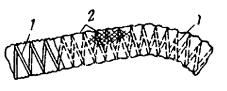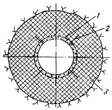 Рис. 75. Шпуровой дренаж внутри зоны цементации, [Л. 109]: 1 - обделка; 2 - шпуровые дрены; 3 - зона цементации. Рис. 76. Трубчатый вкладыш для отвода излишней воды из бетона, [Л. 194]: 1 - пружинная спираль; 2 - оболочка из лент, образованных сплетенными между собой текстильными нитями.