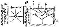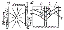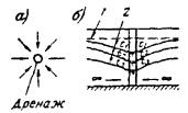Рис. 79. Схема цементации в подземных сооружениях ГЭС Кариба, [Л. 133]: 1 - зона бурения для цементации; 2 - цементационная завеса перед водоприемниками; 3 - цементационная завеса, огибающая водоприемники и заходящая внутрь склона; 4 - главная цементационная завеса по линии напорных водоводов и шахт затворов; 5 - контуры подземных сооружений. ПРИЛОЖЕНИЯ Приложение 1ФИЛЬТРАЦИОННЫЕ РАСЧЕТЫОбщие предпосылки и допущенияВыбор расчетных схем для дренажных устройств, в основном, определяется компоновкой и конструкцией сооружения, характером движения грунтовых вод, граничными условиями дренируемого водоносного массива (пласта), его гидравлическим состоянием, характером и степенью неоднородности водосодержащих пород, схемой расположения и типом дренажных устройств и их положением в водоносном пласте. При расчетах принимается, что в области фильтрации имеет место линейный закон сопротивления движению грунтовых вод (закон Дарси) даже при больших понижениях уровня (в случае общего дренажа) и приуроченности этих вод к трещиноватым закарстованным породам. Нелинейный закон сопротивления движению может возникнуть в редких случаях лишь в непосредственной близости к дренажным устройствам. Граничные условия водоносного массива (пласта) рассматриваются в плане и профиле. При установлении граничных условий в плане реальные гидрогеологические условия для расчетов общего дренажа необходимо схематизировать, сводя их к одной из типовых схем, приведенных в табл. 3, составленной по материалам книги [Л. 5, стр. 88 - 92]. На этих схемах: а - план; б - разрез; 1 - непониженная поверхность грунтовых вод; 2 - кривые депрессии; 3 - дренаж; t - время; h - напор; Q - расход. При слоистом строении дренируемой водоносной толщи и когда водопроницаемые слои чередуются с водоупорными, расчет следует вести независимо для каждого водоносного слоя. В зависимости от гидравлического состояния водоносного пласта дренажные устройства могут работать как в напорных, так и в безнапорных водах. По характеру и степени неоднородности пород в отношении водопроницаемости можно выделить: а) однородные по водопроницаемости толщи породы или массивы; б) неоднородные - слоистые в профиле толщи пород с коэффициентами фильтрации, незначительно отличающимися друг от друга, которые могут быть приведены к однородной по водопроницаемости толще породы; в) неоднородные - слоистые в профиле толщи пород, резко отличающиеся по коэффициентам фильтрации отдельных слоев, которые не могут быть приведены к однородной толще; в этом случае расчет можно приближенно производить по формулам напорного движения грунтовых вод, пренебрегая их движением в слабопроницаемых слоях и рассматривая дренирование каждого слоя независимо от дренирования толщи в целом; Таблица 3
