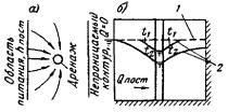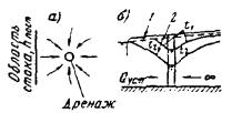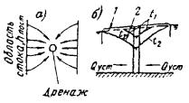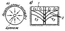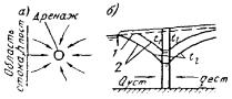 вместо величины Высоту (над водоупором) пониженного уровня грунтовых вод в центре контура можно определить подбором по уравнению П.П. Аргунова Для приближенного нахождения сниженного уровня в центре контура можно пользоваться формулой «большого колодца» При построении депрессионных кривых по уравнениям (34), (35) и (36) при работе несовершенных скважин вводятся расходы несовершенных скважин, определяемые по формуле (33). 2. «Пласт-круг» (табл. 3, схема 8) с постоянным напором на контуре питания (рис. 94).Рис. 94. Система скважин, расположенных по окружности в центре острова: а - план; б - разрез; 1 - непониженный уровень грунтовых вод; 2 - кривая депрессии. В этом случае расчет группы вертикальных скважин производится по формулам установившегося движения грунтовых вод для безнапорных условий, т.е. с использованием формул (32) - (36). При этом вместо радиуса депрессии Rt в них подставляется расстояние R от центра группы до границы контура питания. IV. Одноконтурная горизонтальная дренаРасчет производится в следующем порядке: 1) действительный контур дрены приводится к расчетной окружности с радиусом r0 по формулам (29) - (31); 2) подсчитывается установившийся расход дрены; 3) определяется величина понижения в центре контура при установившейся фильтрации; 4) определяется время понижения. Рис. 95. Схема к расчету кольцевого горизонтального дренажа, расположенного: а - у кровли напорного пласта; б - выше подошвы безнапорного пласта. Расход Q контурной горизонтальной дрены несовершенного типа (рис. 95) можно определить по формулам А.Ж. Муфтахова: а) в напорном пласте