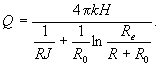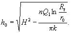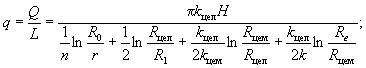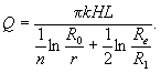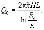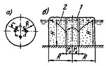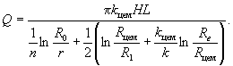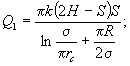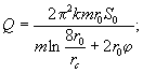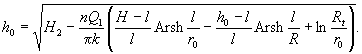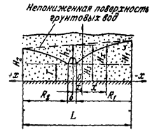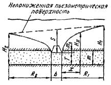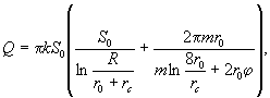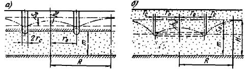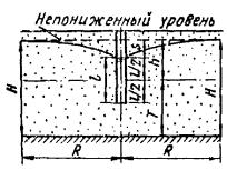 a - коэффициент, зависящий от конструкции скважин (при оборудовании их сетчатыми или гравийными фильтрами примерно равный 20, а при других типах фильтров примерно равный 7); Q1 - расход каждой скважины; S - понижение уровня воды в скважине; k - коэффициент фильтрации водоносного пласта; F - поверхность рабочей части фильтра, равная 2πrcl; R - радиус депрессии; rc - радиус скважины (колодца); σ - половина расстояния между скважинами; n - число скважин в контурной группе; r0 - расчетный радиус контурной группы скважин; rc и l - радиус и длина рабочей части фильтра. в) формула Ю.Г. Трофименкова для скважин несовершенного типа: