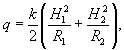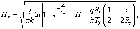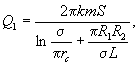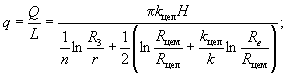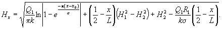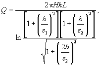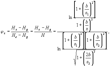 В этих формулах: Q - фильтрационным расход, притекающий в n дрен отрезка туннеля длиной L; k - коэффициент фильтрации породы; H = He - Hg - действующий напор; He - напор на контуре питания (на внешней границе области фильтрации); Hg - напор на контурах дрен; Hx - напор в расстоянии x от оси ближайшей дрены;