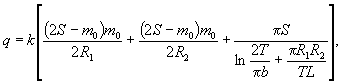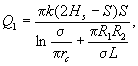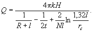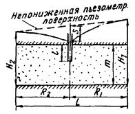где m - мощность пласта; l - длина водоприемной части (фильтра) скважины; R1 - расстояние до границы питания; R2 - то же, до границы стока; L = R1 + R2; S - понижение уровня воды в скважинах. Для несовершенных скважин (l < m) - формула И.А. Чарного