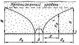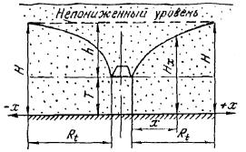 где q - расход дрены на единицу ее длины; H - непониженный напор в водоносном пласте; Rt - радиус депрессии в момент времени t, определяемый по формуле (3). Рис. 86. Схема к расчету длинной прямолинейной горизонтальной дрены, расположенной на подошве безнапорного пласта, с горизонтальной поверхностью естественных грунтовых вод. Депрессионную кривую в плоскости, нормальной к совершенной дрене, можно построить по формуле