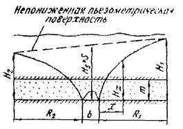 где Hs - непониженный напор в водоносном пласте в месте расположения дрены; m - мощность дренируемого напорного пласта; R1 - расстояние от края дрены до области питания; R2 - расстояние от края дрены до области стока. Рис. 88. График для определения