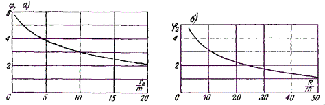 где m и H - мощности соответственно напорного и безнапорного пластов; R - установившийся радиус депрессии; r0 - расчетный (приведенный) радиус контура дрены; rc - радиус дрены; S0 - понижение уровня в водоносном пласте; φ = φ1(r0/m) - φ2(R/m); φ1 и φ2 находится по графикам рис. 96 (при безнапорном пласте вместо m следует подставить H). Рис. 96. Графики функции: а - φ1 в зависимости от r0/m; б - φ2 в зависимости от R/m. Величина остаточного напора hц (рис. 95) в центре контура находится по формулам: а) в напорном пласте