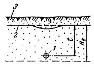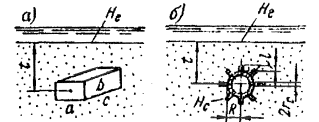 c - расстояние от забоя скважины до водоупора. Приведенные выше формулы для безнапорной фильтрации составлены при допущении о том, что кривая депрессии смыкается с уровнем воды внутри дрены. Поэтому после определения высоты участка (Δh) выхода грунтовых вод в дрену производится корректировка положения кривой депрессии вблизи дрены. Для этого верхнюю точку участка выхода соединяют плавной линией с ранее построенной кривой депрессии. Б. РАСЧЕТЫ МЕСТНЫХ ДРЕНАЖЕЙПри расчете местных дренажей принимаются дополнительные предпосылки и допущения. Фильтрации предполагается установившаяся. Коэффициент площадной пористости α2 фильтрующих сред принимается равным единице. В случаях, особо не оговоренных, бетонная обделка дренируемых сооружений принимается практически водонепроницаемой. Рис. 98. Схемы внешней границы области фильтрации: а - водопроницаемый пласт с глубоким залеганием водоупора; б - горизонтальный напорный водопроницаемый пласт; в - наклонный напорный водопроницаемый пласт; 1 - дренируемое сооружение; 2 - водопроницаемый пласт; 3 - плоская граница области фильтрации; 4 - эквивалентная круговая граница области фильтрации; 5 - уровень воды в водоеме; 0-0 - плоскость отсчета напоров. Для упрощения расчетов принимается граница области питания (внешняя граница области фильтрации) в виде неограниченной плоскости с постоянным напором на ней, равным He (рис. 98). В случае сооружений с протяженностью L и глубиной заложения t (под дно водоема или под зеркало грунтовых вод, если зеркало расположено ниже дневной поверхности), значительно превосходящими поперечные размеры этого сооружения, взамен плоской границы области фильтрации можно принять эквивалентную границу и виде соосного кругового цилиндра с радиусом Re = 2t. При таких заменах внешних границ питания области фильтрации фильтрационный расход и распределение напоров на дренируемой поверхности обделки изменяются практически незначительно. Пользование же эквивалентной схемой кругового цилиндра и шара позволяет существенно упростить фильтрационный расчет дренажей и распространить его результаты на большее число расчетных схем. В случае, когда зеркало грунтовых вод расположено под дневной поверхностью, местное дренирование сооружения может вызвать некоторый прогиб зеркала (рис. 99). Однако благодаря значительному заглублению сооружения под зеркало грунтовых вод прогиб зеркала получается малым и это позволяет с погрешностью, допустимой при практических расчетах, пренебречь прогибом и считать верхнюю границу области фильтрации плоской и принимать ее за поверхность равного напора (аналогично рис. 98,а). Это допущение приводит к практически незначительному завышению дренируемого расхода и эпюры остаточных напоров на поверхности разгружаемого сооружения. При напорной фильтрации в сооружение, расположенное нормально или под углом к водоупорным плоскостям, ограничивающим напорный пласт, при расстоянии от сооружения до плоской границы области питания, значительно превосходящем поперечные размеры этого сооружения, взамен плоской границы контура питания можно принять эквивалентную границу в виде соосного кругового цилиндра с радиусом Re = 2t, где t - расстояние по направлению падения пласта от середины сооружения до плоской границы питания. Приводимые ниже приближенные ф