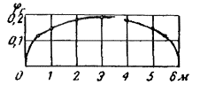 параметр В формуле (81) u и υ - координаты точек на поверхности обделки при начале координат, расположенном в верхней точке контура обделки. Распределение относительных напоров φx на поверхности обделки туннеля, т.е. на контуре BCEFG, определяется по формуле где Hx - напор в произвольной точке поверхности контакта обделки с породой; остальные обозначения в этой формуле те же, что и в формуле (79), причем x = u/(u2 + υ2). (85) В случае некруговой формы сечения обделки необходимо заменить этот профиль эквивалентной окружностью, имеющей длину, равную периметру некругового профиля. Если дрена в туннеле некругового очертания отлична от полукруговой, например, плоская шириной B, то ее необходимо заменить расчетной дреной с профилем в форме полуокружности радиуса r либо с эквивалентным периметром, тогда радиус фиктивной дрены составит r = B/π, либо, что даст еще меньшую погрешность, принять расчетную величину r по формуле (78), в которой теперь следует понимать под b0 ширину фактической продольной дрены прямоугольного сечения, измеренную по контуру поперечника обделки, а под c0 - высоту поперечного сечения фактической дрены, измеренную в радиальном направлении. Пример расчета Задано: туннель корытообразного очертания, дренированный только в лотковой части сплошной дренажной лентой шириной B = 3,5 м; периметр сечения обделки по внешнему контуру 21 м, t = 100 м. Требуется определить распределение фильтрационных напоров вдоль контура обделки и найти расход, поглощаемый дреной. Решение. Диаметр эквивалентной окружности (внешнего контура сечения туннельной обделки) 2R = 21/π = 6,66 м, радиус расчетной дрены r = 3,5/π = 1,11 м. Вычертив фиктивные обделку и дренаж, графически определяем (рис. 108): ub = 0,985×r = 0,985×1,11 = 1,94; υb = 1,94×R = 1,94×3,33 = 6,46 м; по (81) находим ε1 = 1,093/(1,0932 + 6,462) = 0,254 1/м; по (83) определяем ε2 = 1/(2(100 - 3,33)) = 0,00517 1/м; по (80) находим b = 100/(2×3,33(100 - 3,33)) = 0,155 1/м. Подставляя в (84) полученные значения ε1, ε2 и b, а вместо x равную ему величину u/(u2 + υ2), получим