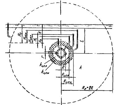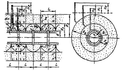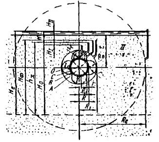 Для значений x в интервале R2 ≤ x ≤ R0 можно приближении принять φx ≈ φb. 2. Зона цементации не примыкает к обделке 1Целесообразность недоведения зоны цементации до обделки была пояснена выше, в разделе В, III,2 настоящего приложения. Дрены в рассматриваемом здесь случае следует располагать на внешнем контуре обделки или внутри «целика». Ниже, для примера, рассмотрен трубчатый продольный дренаж с продольными трубчатыми дренами, расположенными на равных расстояниях друг от друга (рис. 113). Кроме поясненных в предыдущем пункте буквенных обозначений, введем следующие: kцел - коэффициент фильтрации породы внутри зоны «целика»; Rцел - радиус внутреннего расчетного контура зоны цементации; Hцел и Hцем - напоры соответственно на внутреннем и внешнем расчетных контурах зоны цементации; H = He - Hg. Hg и He - напоры соответственно на поверхностях дрен и на внешней границе области фильтрации (на расчетном контуре питания). Соблюдаются условия: n ≥ 3, r << R0, kцел >> kцем. (117) 1°. Полагаем, что R0 ≤ Rцел - R. Рис. 113. Схема к расчету фильтрации в систему продольных дрен, разгружающих обделку от давления грунтовых вод, при наличии противофильтрационной цементации и разделительной зоны. Для расчета расхода и относительных напоров имеем следующие формулы [Л. 119]: