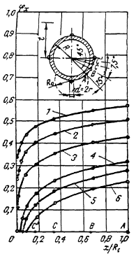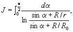 (обозначения угла α и других величин показаны на рис. 106). В табл. 6 приведены числовые значения J, подсчитанные для некоторых комбинаций соотношений R0/R и R/r. Интеграл J не сводится к квадратурам, поэтому его следует определять путем обычного численного интегрирования, суммируя по способу трапеций ряд произведений вычисленных величин подынтегральной функции на Δα, отвечающих нескольким заданным нами числовым величинам α, взятым в интервале от нуля до π/2.