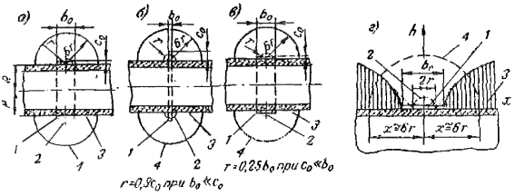 Если дрены имеют прямоугольное сечение с длинами сторон b0 и c0, в расчетные формулы следует подставлять величину радиуса r дрены полукруглого сечения, эквивалентной по расходу (рис. 107): Рис. 107. Схема поперечного сечения кольцевой дрены (а, б, в) и схематический вид эпюры напоров, действующих на обделку вблизи дрены (г) прямоугольного и полукруглого сечений: 1 - дрена прямоугольного сечения; 2 - эквивалентная по расходу дрена полукруглого сечения; 3 - непроницаемая обделка; 4 - эквипотенциаль, близкая к полуокружности. где коэффициент μ определяется из табл. 7 и зависимости от величины γ, причем γ = 2c0/b0 при b0 ≥ 2c0, γ = b0/2c0 при b0 ≤ 2c0.