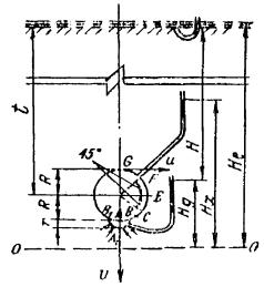 III. Ленточный продольный дренажФильтрационный расход, поступающий в участок продольной одиночной дрены [Л. 89, 90, 92], (рис. 108) длиной L, определяется по формуле где k - коэффициент фильтрации породы; H - перепад напора, H = He - Hg. Рис. 108. Схема к расчету фильтрации в продольную одиночную дрену. He - напор грунтовых вод над плоскостью сравнения 0-0 (рис. 108); Hg - напор на поверхности дрены ВА1В1; R - радиус внешней поверхности обделки; r - радиус дрены полукруглого очертания; t - глубина заложении оси туннеля под дно водоема или зеркало грунтовых вод, t >> R; параметр который при r << R определяется по формуле