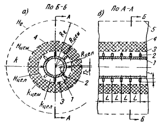 2. Зона цементации не примыкает к обделке [Л. 110]. Расчеты показывают, что зона цементации, если она не примыкает к обделке, хотя и существенно снижает расход грунтовых вод, фильтрующихся через обделку внутрь сооружения, однако эффективность дренажа в отношении разгрузки обделки от давления грунтовых вод получается малой. Чтобы увеличить эффективность дренажа, т.е. снизить величину остаточного напора φb, следует зону цементации вокруг обделки располагать на расстоянии от обделки (рис. 111), оставляя кольцевую зону «целика» (разделительную зону) незацементированной породы или зацементированной слабее, чем в зоне цементации. Рис. 111. Схема фильтрации и расположения шпуровых дрен при наличии противофильтрационной цементации и разделительной зоны: а - поперечный разрез; б - продольный разрез по оси туннеля; 1 - обделка туннеля (шахты); 2 - шпуровая дрена; 3, 4, 5 - окружности с радиусами соответственно Rцел, Rцем, Rе. Дрены в этом случае следует располагать внутри зоны «целика». Рассмотрим случай шпуровых дрен, расположенных в соответствии с пояснениями, сделанными в пункте I,1 (Шпуровой дренаж) раздела Б настоящего приложения. Все буквенные, обозначение названного пункта, а также предыдущего пункта остаются в силе. Дополнительные обозначения: Rцел - радиус внутреннего контура зоны цементации; kцел - коэффициент фильтрации породы в зоне «целика»; Hцел и Hцем - напоры соответственно на внутреннем и внешнем расчетных контурах зоны цементации; φцел и φцем - относительные напоры на упомянутых контурах; φцел = (Hцел - Hc)/H; (101) φцем = (Hцем - Hc)/H; (102) H = He - Hc; (103) Причем, по-прежнему, Hc и He напоры соответственно на поверхностях шпуровых дрен на внешней границе области фильтрации (на расчетном контуре питания). Соблюдаются условия: 0 < kцел/k ≤ 1; 0 < kцем/k ≤ 1; n ≥ 3; m ≥ 5; l/rc ≥ 4; l/R ≤ 1; l/( Rцел - R) ≤ 0,85; 0,5Re/Rцем >> 1. (104) Для расчета расхода и относительных напоров имеем следующие формулы [Л. 110]: