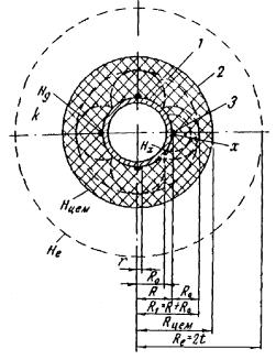 Здесь буквенные обозначения остаются такими же, как в предыдущем подразделе I,1. Пример расчета 1 t = 150 м, R = 6,0 м, rc = 0,025 м, H = 150 м, k = 0,1 м/сутки, N = 16, 2b = 5,3 м. По формуле (89) определяем φb = 0,085. Пример расчета 2 N = 256, 2b = 1,33 м. Остальные данные - по примеру 1. Из (89) находим φb = 0,770. В. РАСЧЕТЫ ПРОТИВОФИЛЬТРАЦИОННОЙ ЦЕМЕНТАЦИИВ этом разделе рассматриваются примеры расчета влияния противофильтрационной цементации породы вокруг туннеля (шахты) на снижение давления грунтовых вод на обделку [Л. 89, 91, 92]. I. Исходные предпосылки и обозначения:а) задача плоская; область фильтрации состоит из трех слоев: 1 - бетонная (железобетонная) обделка, 2 - зона цементации, 3 - незацементированная порода заключенных между коаксиальными цилиндрическими поверхностями с радиусами R0, R, Rцем, Re = 2t (рис. 110); б) среда в объеме каждого слоя изотропна и однородна по водопроницаемости с коэффициентами фильтрации: обделки - kб, зоны цементации - kцем и незацементированной породы - k; в) расстояние t от границы А-А области питания до оси сооружения предполагается значительно превосходящим радиус Rцем зоны цементации: t >> Rцем; г) последнее условие позволяет границу области питания - горизонтальную плоскость А-А с напором He над плоскостью сравнения О-О заменить цилиндрической поверхностью с радиусом Re = 2t, имеющей тот же напор He; д) предполагается, что каждая поверхность раздела слоев является эквипотенциальной; Риг. 110. Схема к расчету фильтрации через бетонную обделку с противофильтрационной цементацией: 1 - обделка; 2 - зона цементации; 3 - незацементированная порода. Q - фильтрационный расход, поглощаемый участком туннеля длиною L; H0 - напор внутри туннеля (шахты), при отсутствии воды в туннеле H0 можно приближенно принять равным превышению центра туннеля над плоскостью сравнения О-О; Hб - напор на поверхности контакта бетона с зацементированной породой; Hцем - напор на внешней границе зоны цементации; Hб - H0 - напор, погасившийся в бетонной обделке; Hцем - Hб - напор, погасившийся в зоне зацементированной породы; He - Hцем - напор, погасившийся в зоне незацементированной породы. Полная потеря напора равна действующему напору H: H = He - H0. II. Цементация без дренажаВеличина относительного напора, гасящегося в бетонной обделке φб, и относительного напора, гасящегося в бетонной обделке и зоне цементации φбц, определяется по формулам [Л. 89, 91, 92]: Фильтрационный расход определяется из выражения