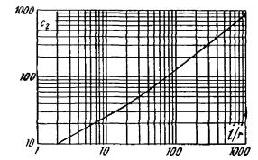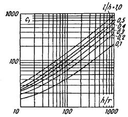 Формулами табл. 14 можно пользоваться в интервале значений коэффициента фильтрации от 0,01 до 10,0 м/сутки и удельного водопоглощения от 0,01 до 10,0 л/мин×м2. Рис. 115. Схема проведения опыта по нагнетанию в псевдонасыщенный грунт: 1 - тампоны в скважине; 2 - труба, подающая воду от насоса или водонапорного резервуара; 3 - манометр; 4 - уровень грунтовых вод перед началом нагнетания. Рис. 116. Графики зависимости с1 от h/r и l/h (составлены Бюро мелиорации США), [Л. 115]. Рис. 117. График зависимости c2 от l/r (составлен Бюро мелиорации США), [Л. 115]. Рис. 118. График для выбора формулы для вычисления коэффициента фильтрации при скважине, расположенной в неводонасыщенной зоне грунта (составлен Бюро мелиорации США). [Л. 115]. Величина переходного коэффициента c = k/q в изверженных и карбонатных породах колеблется от 2,0 до 3,5; в песчано-глинистых - от 1,1 до 3,5 с увеличением соотношения при уменьшении водопроницаемости. Для пород, не охваченных табл. 14, величину c следует определять с помощью соответствующих формул, имеющихся в инструкциях и методических указаниях [Л. 68, 69]. 2. Интервал нагнетания расположен выше уровня грунтовых водПри расположении интервала нагнетания выше уровня грунтовых вод (рис. 115) для вычисления величины c можно пользоваться следующими формулами Бюро мелиорации США [Л. 115]: