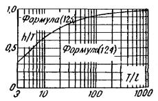 где h - расстояние от подошвы дрены до непониженного уровня воды; b - ширина дрены; T - расстояние от подошвы дрены до водоупора. Рис. 87. Схема к расчету длинной прямолинейной горизонтальной дрены, расположенной выше подошвы безнапорного водоносного пласта, с горизонтальной поверхностью естественных грунтовых вод. Депрессионную кривую в плоскости, нормальной к несовершенной дрене, можно построить по формуле