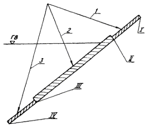 * В районах с малоразвитой сетью автомобильных дорог для сооружений, имеющих особо важное народнохозяйственное значение, при технико-экономическом обосновании вероятность превышения допускается принимать 0,33 вместо 1 % и 1 вместо 2 %. ** В районах с развитой сетью автомобильных дорог для автодорожных малых мостов и труб при технико-экономическом обосновании вероятность превышения допускается принимать 2 вместо 1 %, 3 вместо 2 %, 5 вместо 3 %, а для труб на дорогах II-с и III-с категорий - 10 %. 1.10. Верхняя граница крепления откоса располагается выше расчетного уровня (см. табл. 1 и 2) на величину высоты наката волн, ветрового нагона и подпора, возможных при расчетном шторме (см. п. 3.19 настоящих Норм), а также постоянного запаса а ≥ 0,25 - 0,5 м (СНиП II-39-76, СНиП 2.05.03-84). Причем при расчете на уровни малой обеспеченности (0,33 - 5 %) принимают в расчет величину высоты наката волны 1 %-ной обеспеченности в системе волн расчетного шторма 50 %-ной обеспеченности (1 раз в 2 года). Для условий водохранилищ при расчетах на нормальный подпорный уровень (НПУ) и другие длительно стоящие уровни (50 %-ной обеспеченности и более) принимают в расчет величину наката волны 1 %-ной обеспеченности в системе волн расчетного шторма 4 %-ной обеспеченности (1 раз в 25 лет). 1.11. Верхняя граница основного крепления доводится до отметки, соответствующей высоте наката волн 50 %-ной обеспеченности по накату (эта высота получается умножением величины наката волны 1 %-ной обеспеченности на коэффициент 0,68). Обеспеченность шторма принимается в соответствии с п. 1.10. 1.12. Нижнюю границу основного крепления следует назначить на глубине d = 2h1%, считая от расчетного уровня воды, но она не должна быть выше места припая ледяного покрова к откосу. Высоту волны 1 %-ной обеспеченности h1% берут в системе шторма 50 %-ной обеспеченности на расчетном уровне. 1.13. Верхняя граница облегченного покрытия определена в п. 1.10. Покрытие расположено выше основного и должно противостоять действию потока воды при накате волны (скорость, давление и противодавление). Скорости волнового потока на откосе рассчитывают по формулам ВСН 183-74, приведенным в рекомендуемом приложении 1. Давление и противодавление определяют по п. 1.15 СНиП 2.06.04-82*. * Приведенные формулы справедливы также для расчета размывающих скоростей в основании откоса в месте перехода крутых откосов в пляжные (пляжные откосы считаются с заложением m > 5). 1.14. Нижнюю границу облегченного покрытия откоса, расположенного ниже основного, назначают из условия неразмываемости грунтов откоса донными волновыми скоростями, которые также определяют по формулам рекомендуемого приложения 1. При этом принимают среднюю длину и 1 %-ную высоту волны в системе шторма 4 %-ной обеспеченности на расчетном уровне. 1.15. Конструкции основного и облегченного покрытий рассчитываются на прочность и устойчивость от воздействия волнового потока (скорость, давление и противодавление) волны 5 %-ной обеспеченности в системе волн расчетного шторма 4 %-ной обеспеченности на расчетном уровне. Крепления откосов следует проектировать в соответствии с требованиями разд. 1 СНиП 2.06.04-82* и настоящих Норм. 1.16. При применении гибких покрытий необходимо пользоваться Рекомендациями1. 1 Рекомендации по проектированию и строительству гибких железобетонных покрытий откосов транспортных сооружений. М., ЦНИИС, 1984. 1.17. Обеспеч
